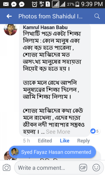 পরে সামাজিক যোগাযোগ মাধ্যম ফেসবুকে বিষয়টি চমৎকারভাবে উপস্থাপন করেন শহীদুল ইসলাম জেমস। তাঁর লেখাটিতে শত শত লাইক আর কমেন্ট পরতে থাকে। সবাই শোভা মাঝিকে নিয়ে লেখার জন্য চেয়ারম্যান শহীদুল ইসলাম জেমস-এর উদার মানসিকতার প্রশংসা করে ধন্যবাদ জ্ঞাপন করছে।